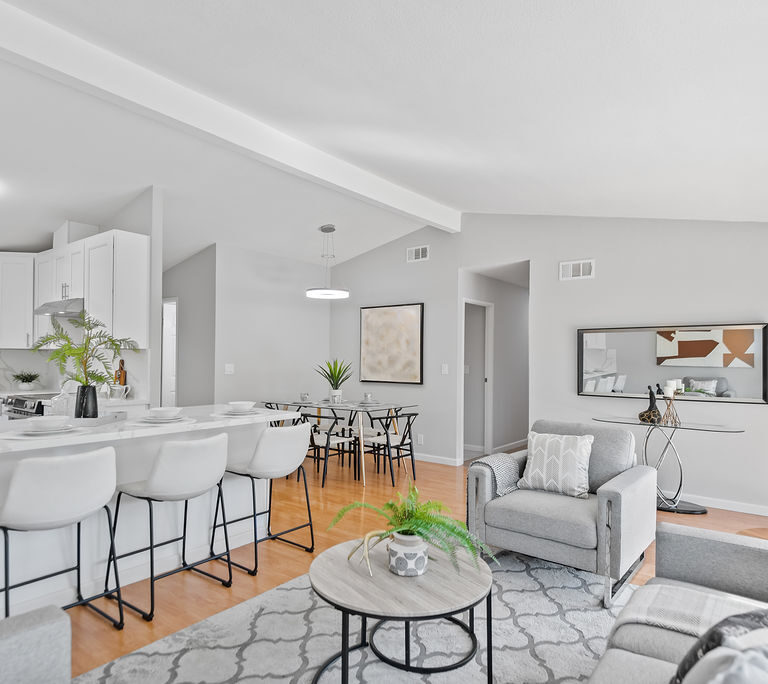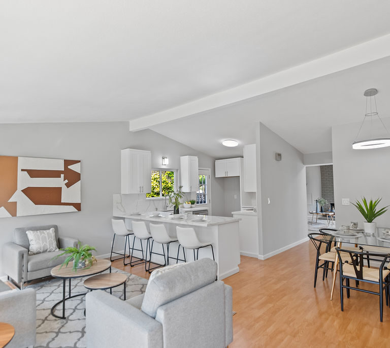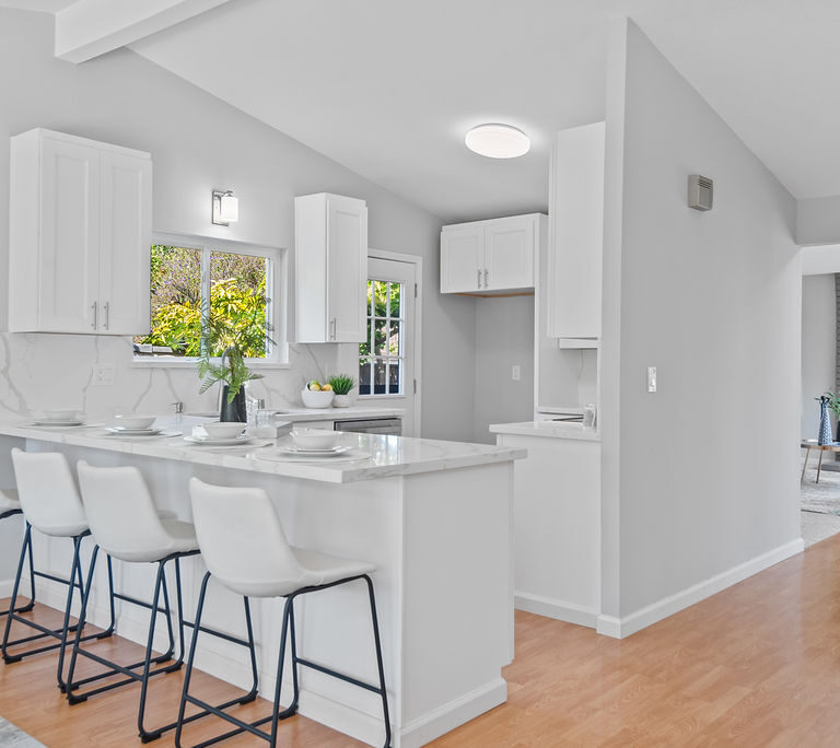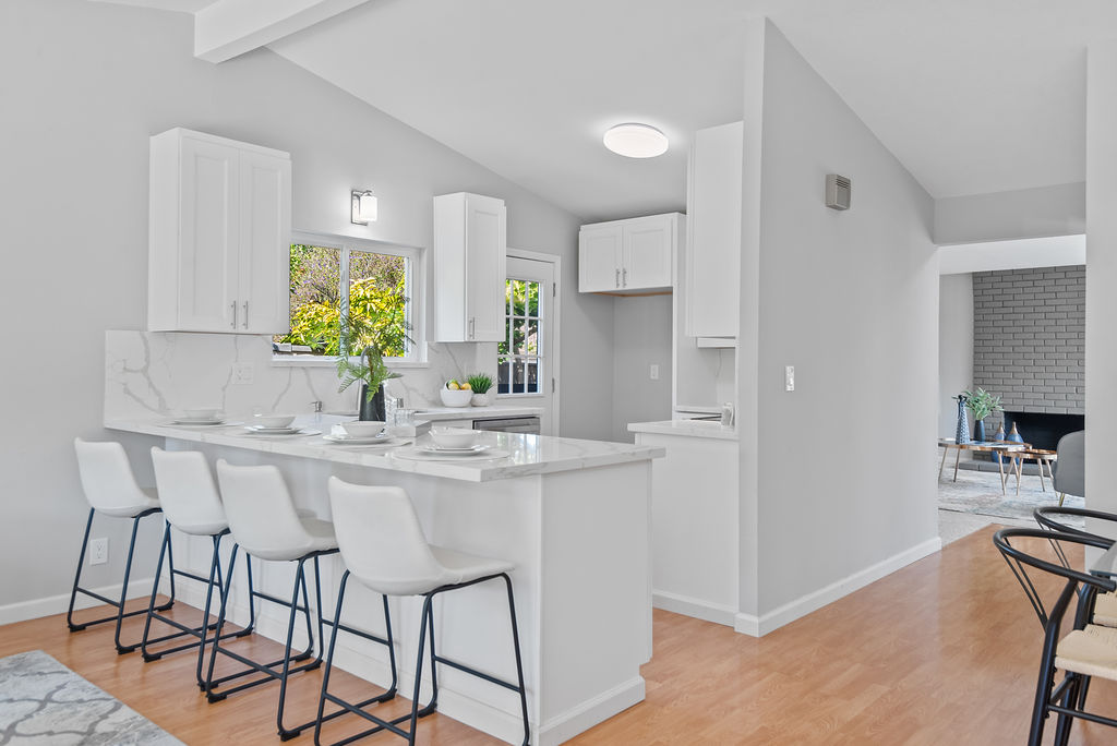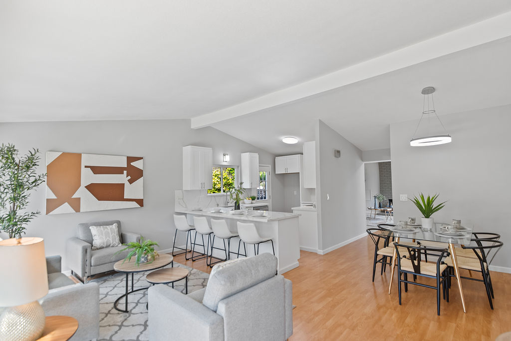 The updated kitchen is a modern chef’s delight with open layout, white shaker cabinets, quartz counters and matching backsplash, stainless steel appliances, and convenient peninsula. The adjacent dining room features vaulted ceiling and is elegant for dinner parties and nights in.