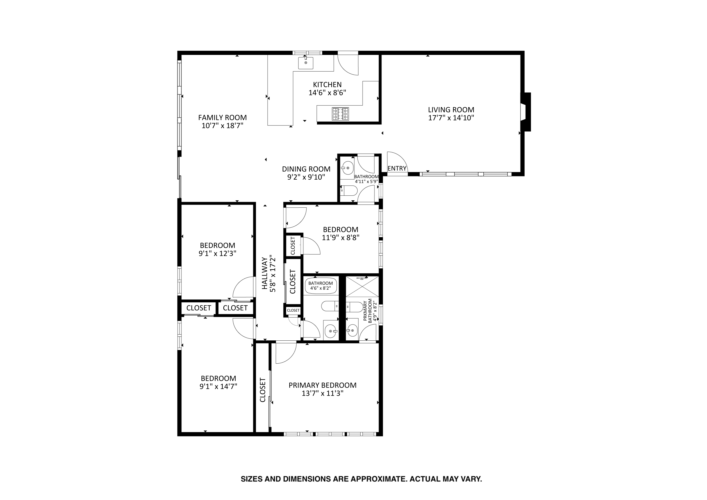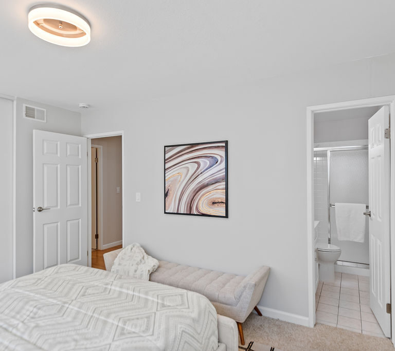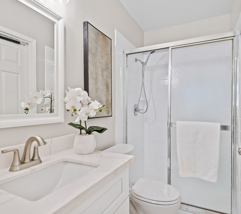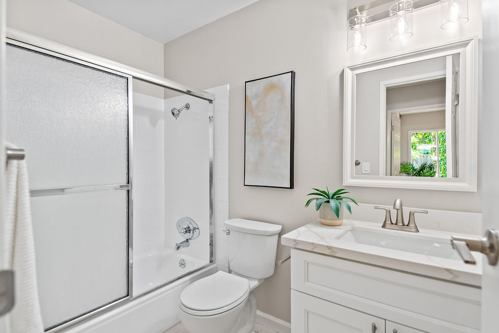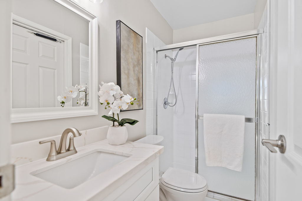 The updated kitchen is a modern chef’s delight with open layout, white shaker cabinets, quartz counters and matching backsplash, stainless steel appliances, and convenient peninsula. The adjacent dining room features vaulted ceiling and is elegant for dinner parties and nights in.