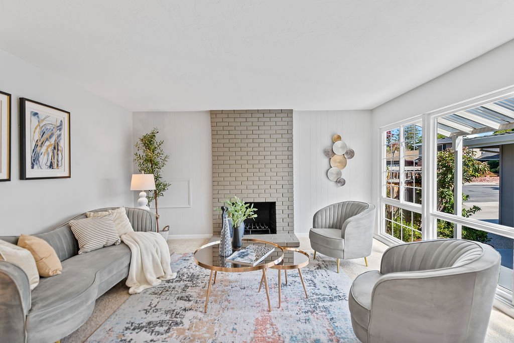 Inside, the living room features a cozy brick fireplace and large windows overlooking the private courtyard.